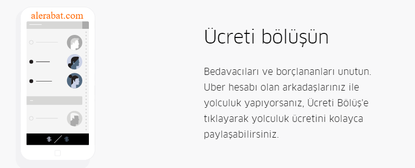Uber yolculuklarında size çeşitli araç seçenekleri sunuluyor. Ekonomi araçlarını günlük yolculuklarınızda, Premium araçlarını ise lüks seyahatlerinizde seçme imkanınız var. Tekerlekli sandalye kullanan ya da oto güvenlik koltuğu gerektiren kullanıcılar ise Erişilebilirlik araçlarını tercih edebilirler. Şayet yolculuğunuzu diğer Uber kullanıcıları ile paylaşmayı planlıyorsanız, Ortak Kullanım araçlarına da göz atabilirsiniz. Yolculuğu başka biriyle paylaşmak istediğinizde, uygulama menüsünden “Ücreti Paylaş” özelliğinden yararlanabilir, yolculuk sonrasında yol ücretinin tüm kartlardan eşit miktarda çekilmesinden yararlanabilirsiniz. Uber şirketler için de kurumsal seyahat hizmetleri sunuyor. Taksiye göre %40 oranında tasarruf edebileceğiniz Uber seyahat ile toplantıları ve iş seyahatlerini akıllıca planlayabilir, dilediğiniz sayıda çalışanı kurumsal hesabınıza ekleyip çıkartabilir, yolculuklarına ait bilgilere anında ulaşabilir ve yıllık seyahat bütçelerinden büyük indirimler elde edebilirsiniz.
